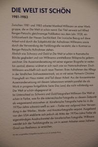 Seine zahlreichen Fotos, zeigen Szenen aus seinem persönlichen Umfeld in Graz und der Südsteiermark. Umfangreiche Serien, darunter die einflussreichen Arbeiten „Schwarz und Gold“ und „Das Land“ sind in der Ausstellung zu sehen. Heute den 7.2 2019, wurde die Ausstellung im Beisein des Künstlers und im Rahmen eines Vortrages feierlich eröffnet. Für die musikalische Untermalung sorgten die Oberösterreichische Band Attwenger, die Lieder in Mühlviertler Mundart zum Besten gaben. Die Ausstellung kann von 8. Februar bis 26. Mai 2019 im Wiener Albertina Museum, besucht werden. https://www.albertina.at/ausstellungen/manfred-willmann/