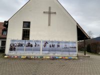 Die Ausstellung von „Alle an einem Tisch als Begegnungsort“ präsentiert auf die Außenfassade der Erlöserkirche Kiefersfelden - Bayern in 1x2 Meter großen Bildern an. Die Bilder sind für 17 Tage auf die Außenfassade der evangelischen Kirche ausgestellt und täglich ab 17 Uhr für eine Stunde mit Licht angestrahlt.