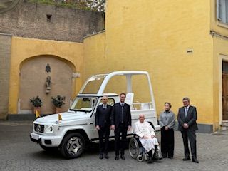 Marc Langenbrinck, CEO von Mercedes-Benz Italia, übergab Papst Franziskus am 4. Dezember 2024 anlässlich des Jubiläums 2025 ein neues Papamobil. Es handelt sich um ein perlweißes, 100-prozentiges Elektroauto der G-Klasse, das in den Rahmen passt der Enzyklika „Laudato si“, da sie ökologisch ist. Es ist das erste elektrische Papamobil, das von der Mercedes-Fertigungsabteilung hergestellt wird und über 587 PS mit 4 Elektromotoren verfügt.