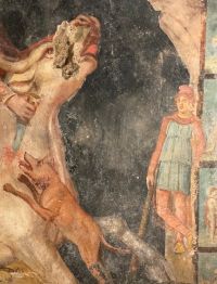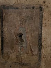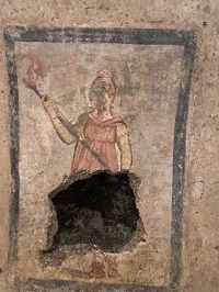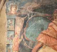Das Mithräum in der Stadt Marino (Rom).Wand mit Tauroktonie-Fresko im Mithräum