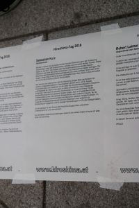 Wien stand auch heuer wieder ganz im Zeichen von Atomstrom Nein Danke, bei der jährlichen Gedenkveranstaltung, zum Bombenangriff auf Hiroshima. Diverse interessante Reden waren zu hören, wie etwa von Alois Reisenbichler zum Thema Atomstrom, (der seit Jahren aktiv im Wiener Friedensbüro mitarbeitet, und diesen Event mitgestaltet), sowie von dem Generalsekretär des Österreichischen Roten Kreuzes Dr. Werner Kerschbaum. Auch für musikalische Unterhaltung war gesorgt, so sang Ernst Toman einige Friedenslieder. Im Rahmen dieser Aktion wurden zudem Grußadressen von prominenten Persönlichkeiten, aus Politik und Kultur vor Ort veröffentlicht. Mit dem Laternenmarsch vom Stephansplatz zur Karlskirche, fand diese tolle Veranstaltung seinen Ausklang.