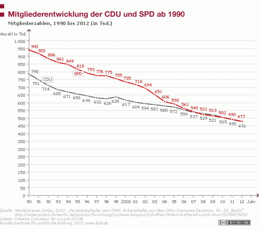 Die Verantwortlichen in den Parteizentralen müssen sich damit abfinden, dass ihre Mitgliederzahlen weiter schrumpfen werden. Nicht zuletzt auch deshalb, weil in überalterten Parteien mehr Mitglieder sterben als neue eintreten. Auf Dauer werden die Parteien nicht mehr kampagnefähig sein. Besonders in ländlichen Gegenden ist das schon heute der Fall. Deshalb stellt sich zu Recht die Frage, ob die Ära der Volksparteien beendet ist. Natürlich streiten das die Profi-Politiker ab. Eine Volkspartei sei nicht nur von ihrer Mitgliederstärke abhängig zu machen, entscheidend sei, ob man die ganze Breite der Gesellschaft abdeckt.